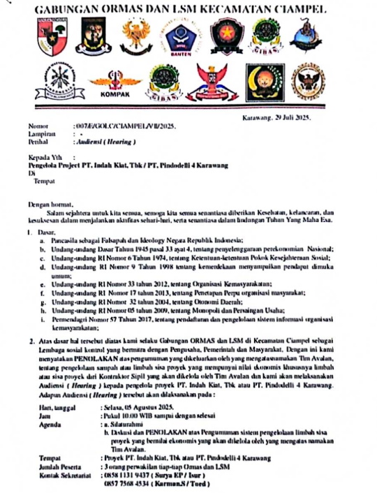 Gabungan ormas dan LSM yang mengatasnamakan diri sebagai mitra sosial kontrol—seperti Pemuda Pancasila, Laskar NKRI, Gibas, Brigez, hingga GMBI—melayangkan surat pemberitahuan audiensi ke Polsek Ciampel. Agenda mereka? Menuntut penjelasan atas sistem pengelolaan limbah sisa proyek bernilai ekonomis yang kini dikelola oleh pihak ketiga, yakni Tim Avalan, bukan lagi oleh masyarakat sekitar.