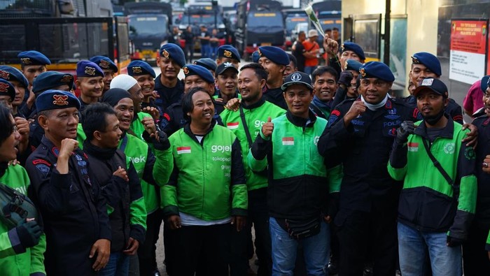 Jakarta – Suasana harmonis terlihat di depan Markas Brimob Polda Metro Jaya, Kwitang, Jakarta Pusat, pada Selasa (2/9/2025). Sejumlah pengemudi ojek online (ojol) menggelar aksi damai dengan bersalaman dan berpelukan bersama anggota Brimob.