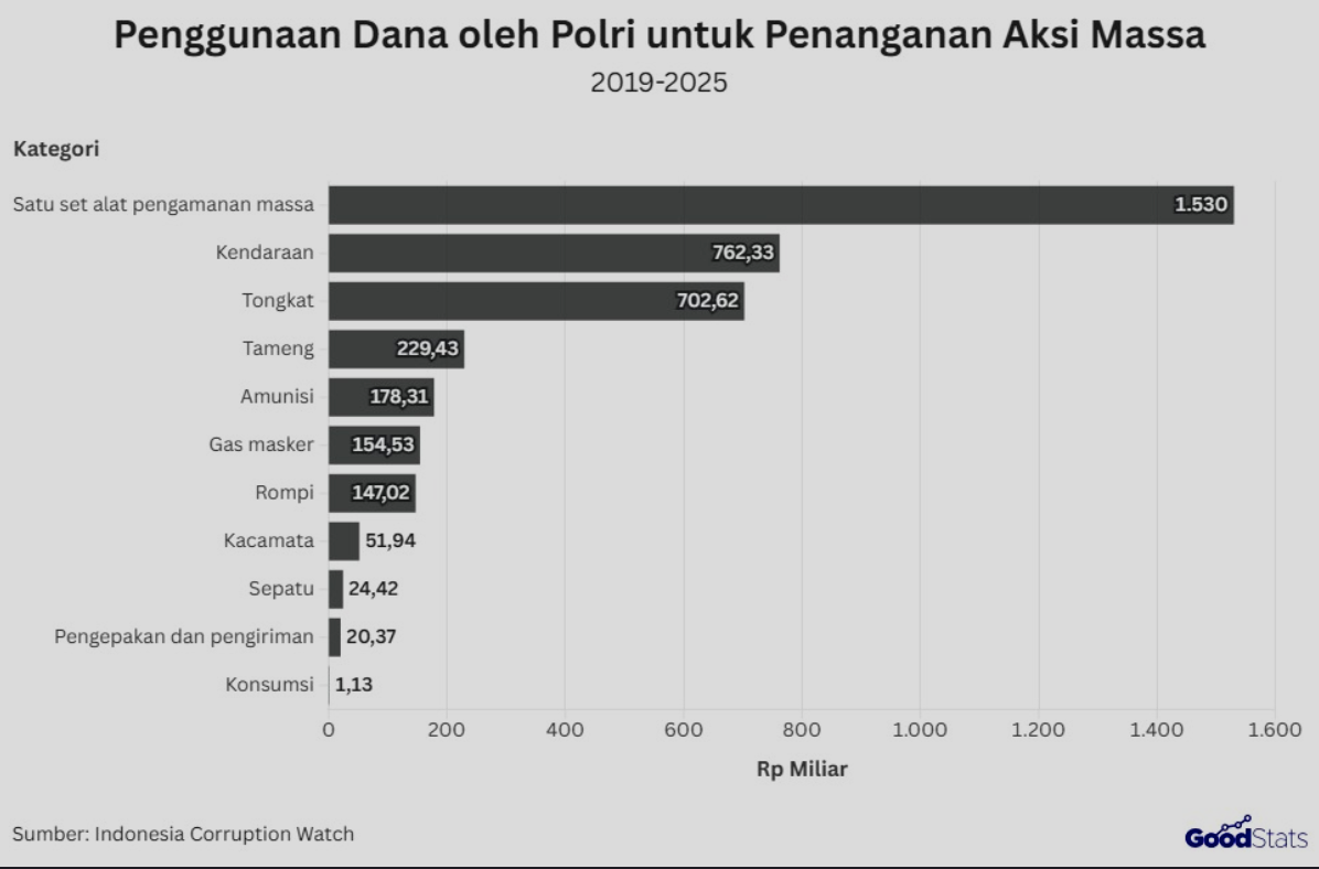 ICW mencatat dana tersebut digunakan untuk pengadaan berbagai perlengkapan taktis yang kerap diterjunkan dalam pengamanan demonstrasi. Namun, mereka menilai pendekatan ini lebih menekankan aspek pengendalian massa daripada membangun dialog dan merespons aspirasi secara substansial.