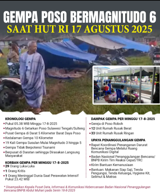 KabarNetizenTerkini: Poso, Sulawesi Tengah – Dampak gempa bumi berkekuatan magnitudo 5,8 yang mengguncang Kabupaten Poso pada Minggu (17/8/2025) semakin dirasakan. Hingga Selasa (19/8), tercatat dua korban meninggal dunia setelah mendapat perawatan intensif di Rumah Sakit Umum Daerah (RSUD) Poso.